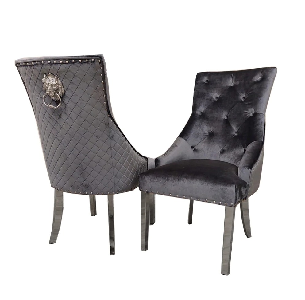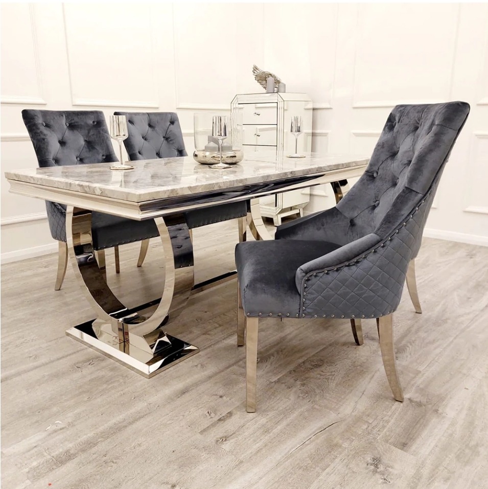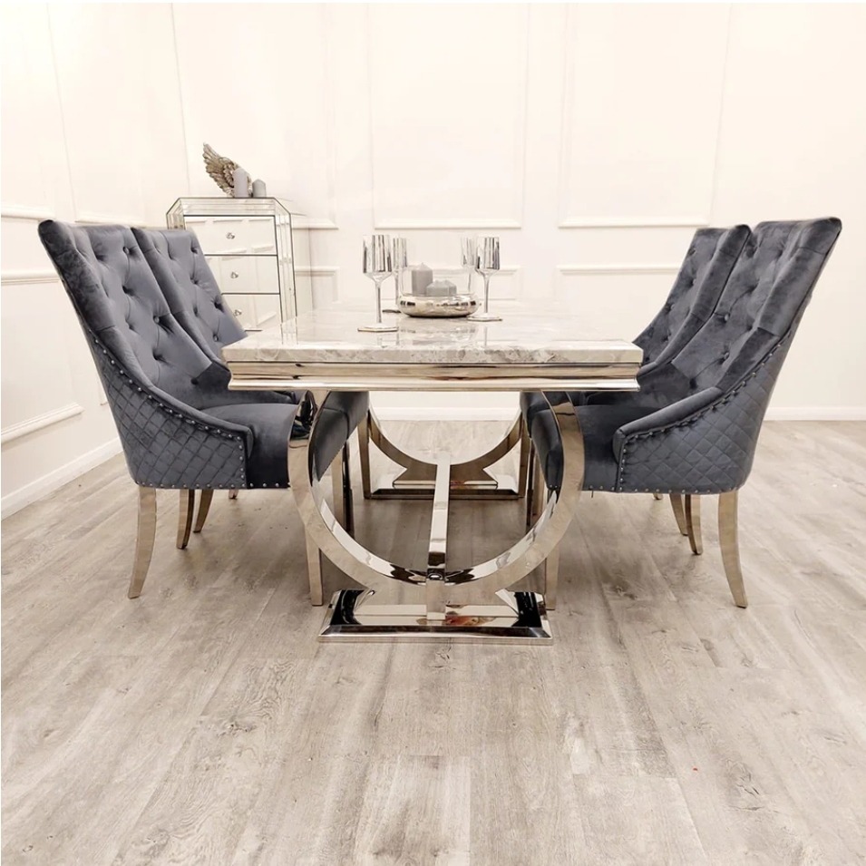 Louise Chrome 1.5 Grey Marble Table with 4 Bentley Grey Shimmer Chairs