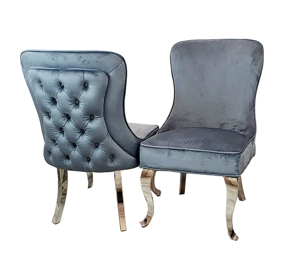 The Sandhurst Dining Chair range is the ideal choice for a large scale luxury style. This beautiful range features a deep buttoned back on a smooth velvet finish. Curved chrome legs complete this range. Available in Light Grey, Dark Grey and Pink.